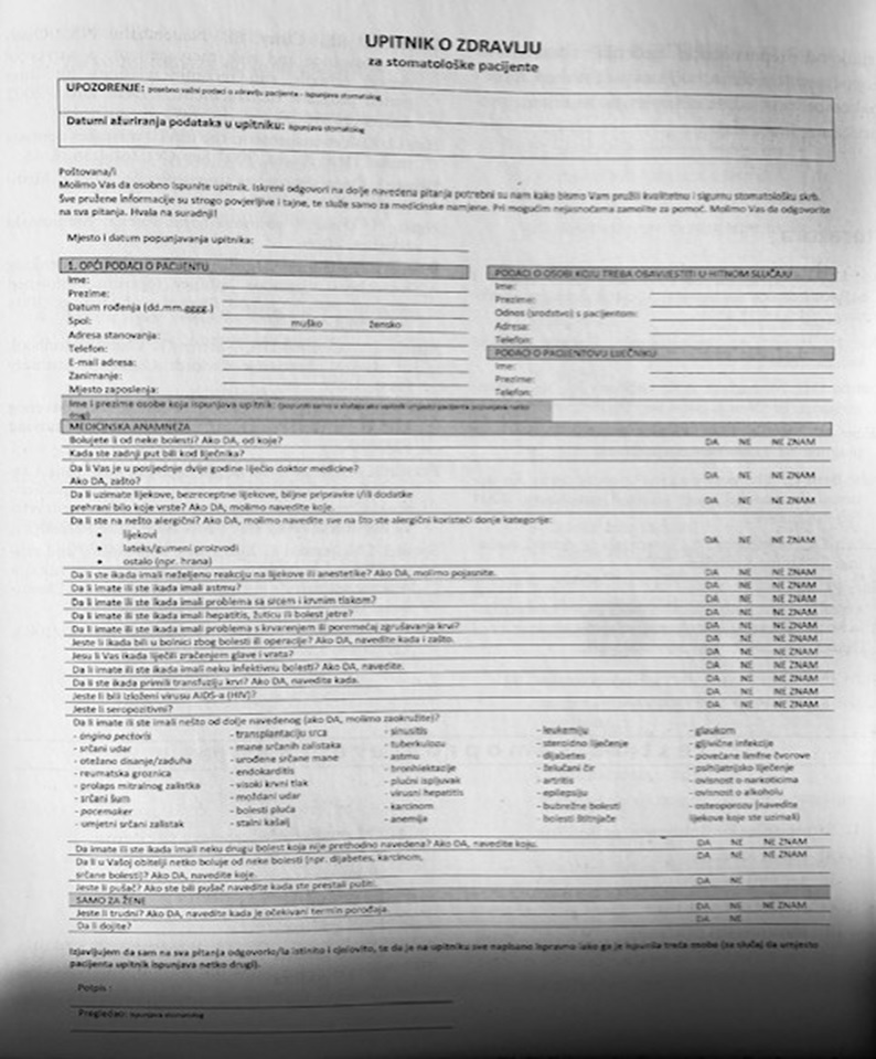 Iznimno je važno uzeti detaljnu medicinsku anamnezu pacijentima koji se prvi put javljaju stomatologu u ordinaciju, kako bi smo se informirali o njegovom zdravstvenom stanju. Također, pacijentima koje nismo vidjeli duže vrijeme, potrebno je osvježiti medicinsku anamnezu.